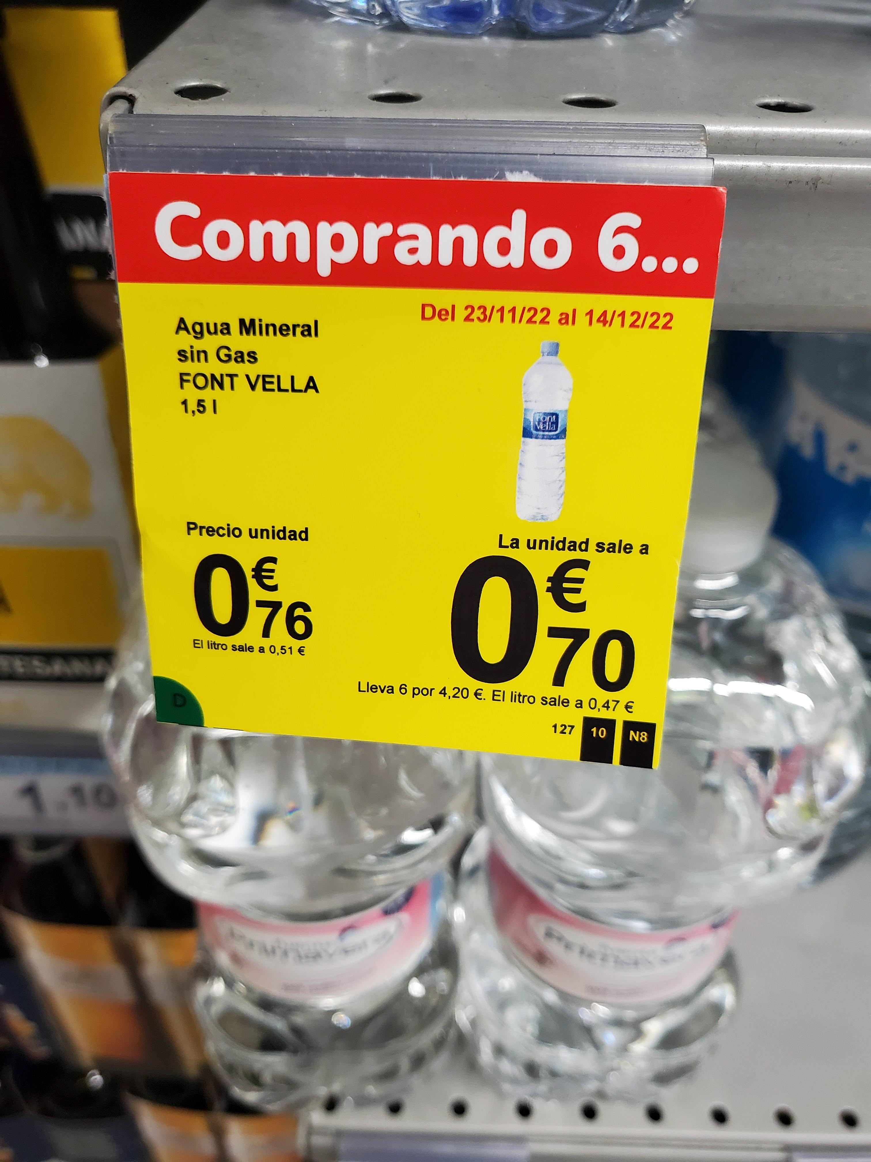 12월 14일까지 1.5L 짜리 물을 0.7유로에 팔고 있습니다. 스페인식당에서는 물을 따로 사야하는데 500mL짜리가 보통 2~2.5유로 하는 걸 감안하면 상당히 저렴한 가격입니다.