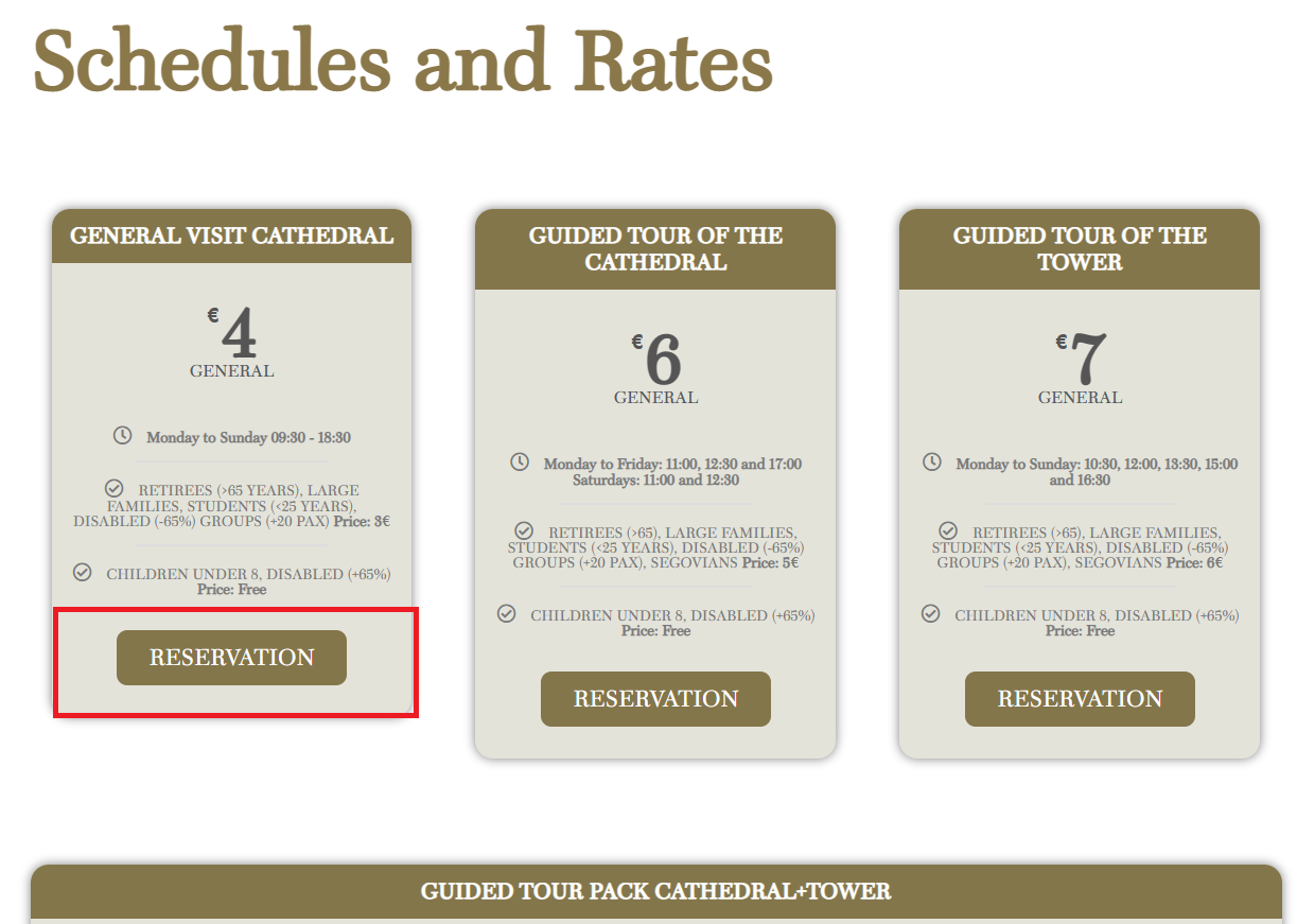 1. Horarios y tarifas de visita - Catedral de Segovia (catedralsegovia.es) 링크를 클릭하여 접속해줍니다.