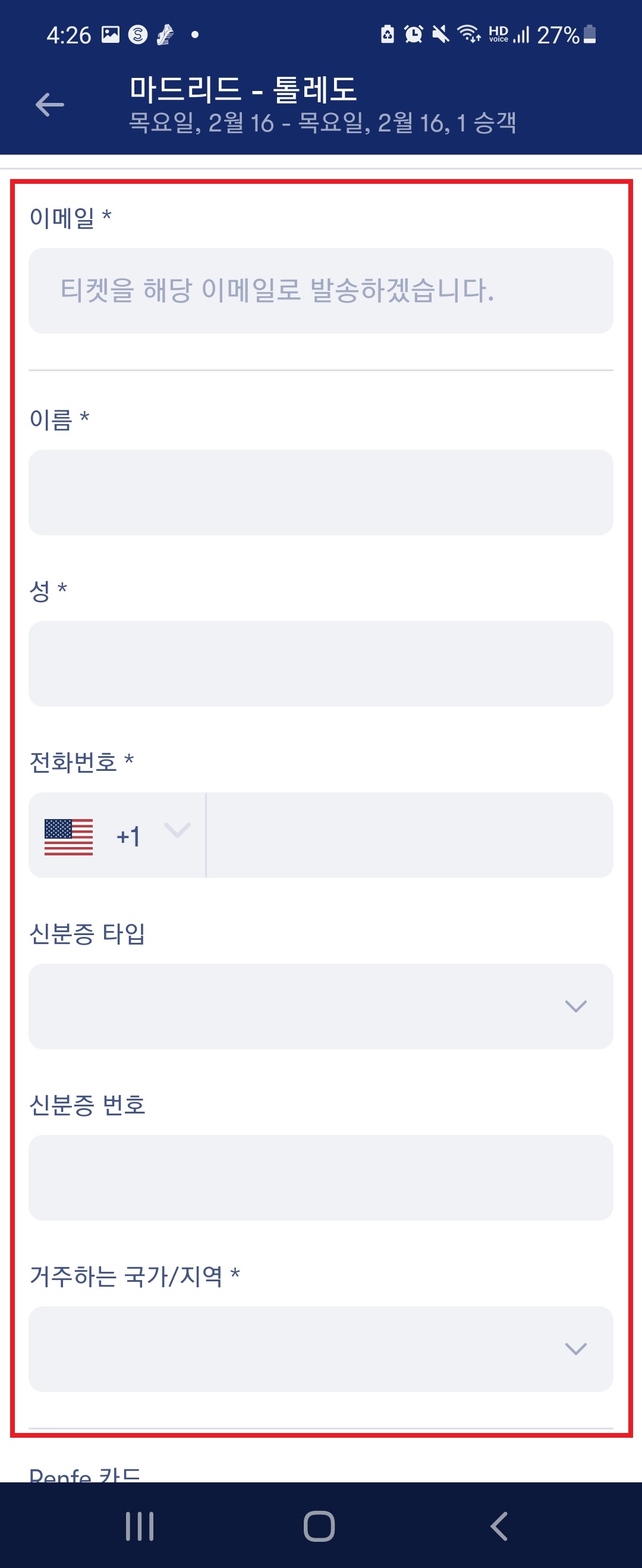 Document는 other document로 카테고리를 바꾼 뒤, Document Number에 여권번호를 기재해주세요