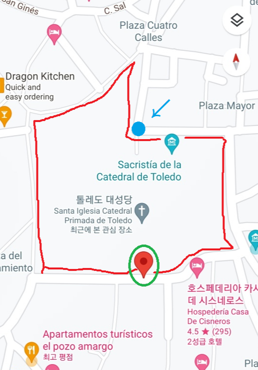 빨간색 테두리는 톨레도 대성당의 외벽이고, 아래 초록색 동그라미는 대성당 정문이 있는 위치입니다.