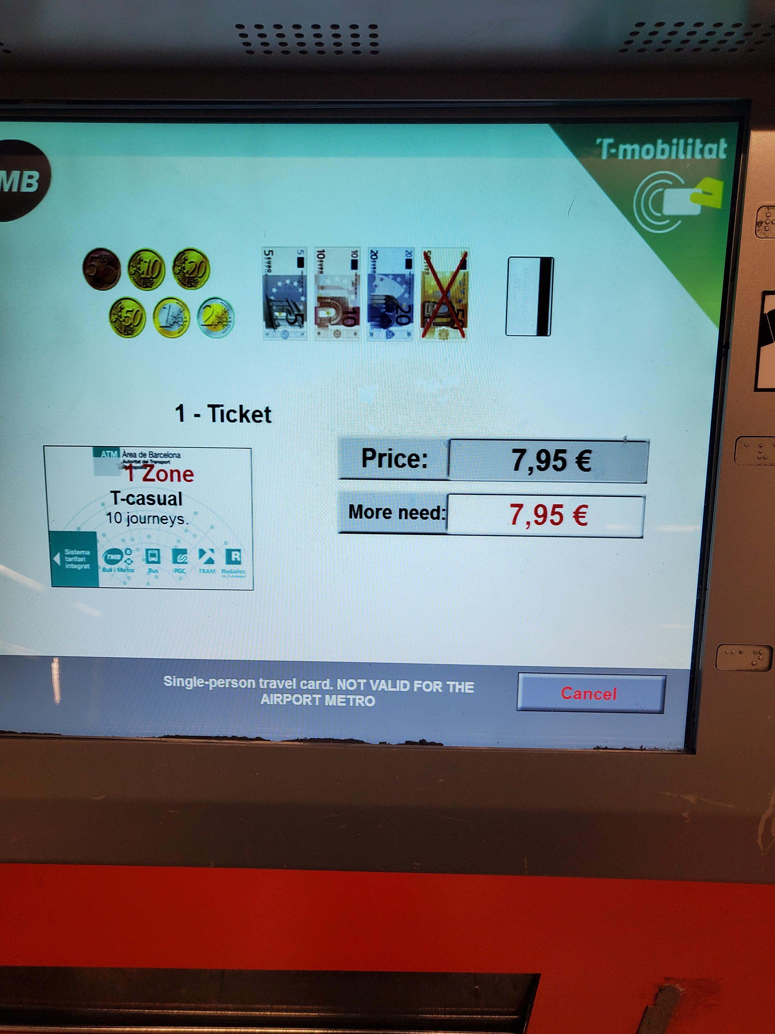 아래에 나온 종이표가 매표 기기에서 나온 10회권 표입니다. 마드리드에서는 플라스틱 카드와는 달리 종이표 표가 뽑혔기때문에 별도의 발급 금액은 필요없이 깔끔하게 7.95유로가 들었습니다. 그럼 이 종이표를 어떻게 사용을 할까요?