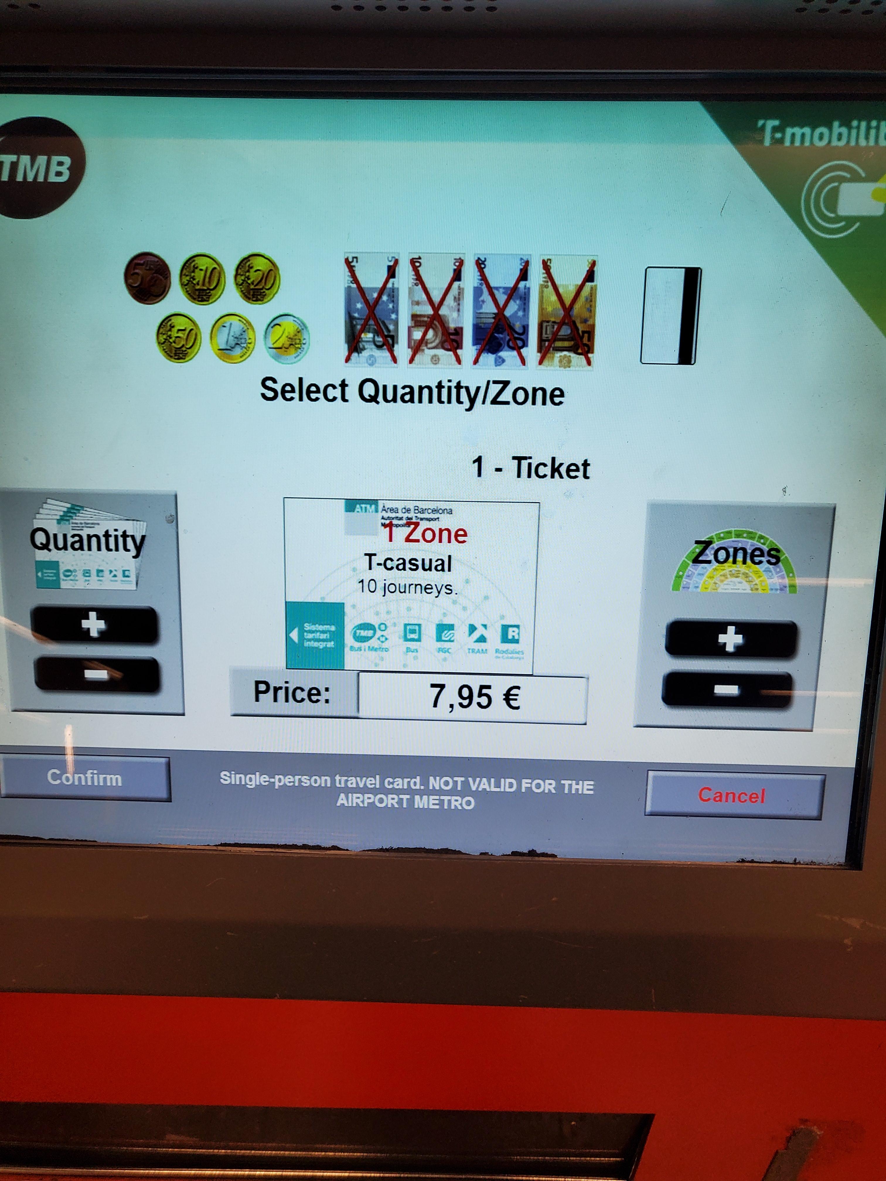 3] 수량과 구역(ZONE)을 설정해 주세요. 참고로 바르셀로나를 지하철로 여행하는데 1 ZONE이면 충분하니 우측에 Zones은 건들지 않아도 됩니다. 왼쪽 하단에 confirm을 눌러주세요