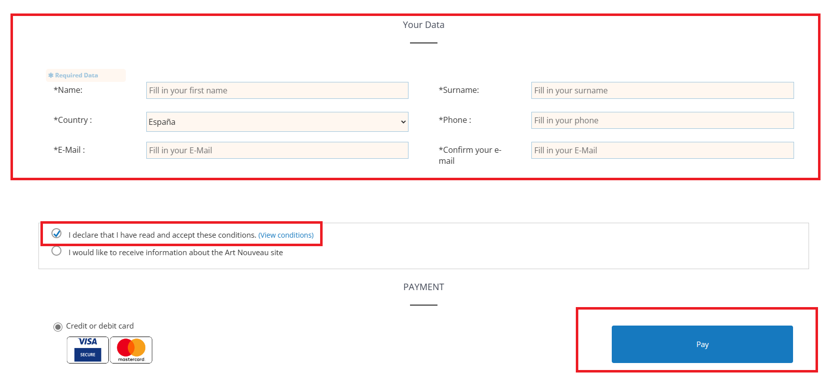 8. 이름, 국적, 성, 핸드폰 번호, 이메일을 기재한 뒤 아래 체크 박스를 체크해 주시고 pay를 클릭해 주세요