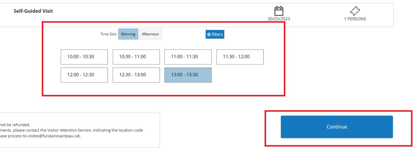7. 원하는 방문 시간대를 클릭한 뒤, Continue를 클릭해 주세요
