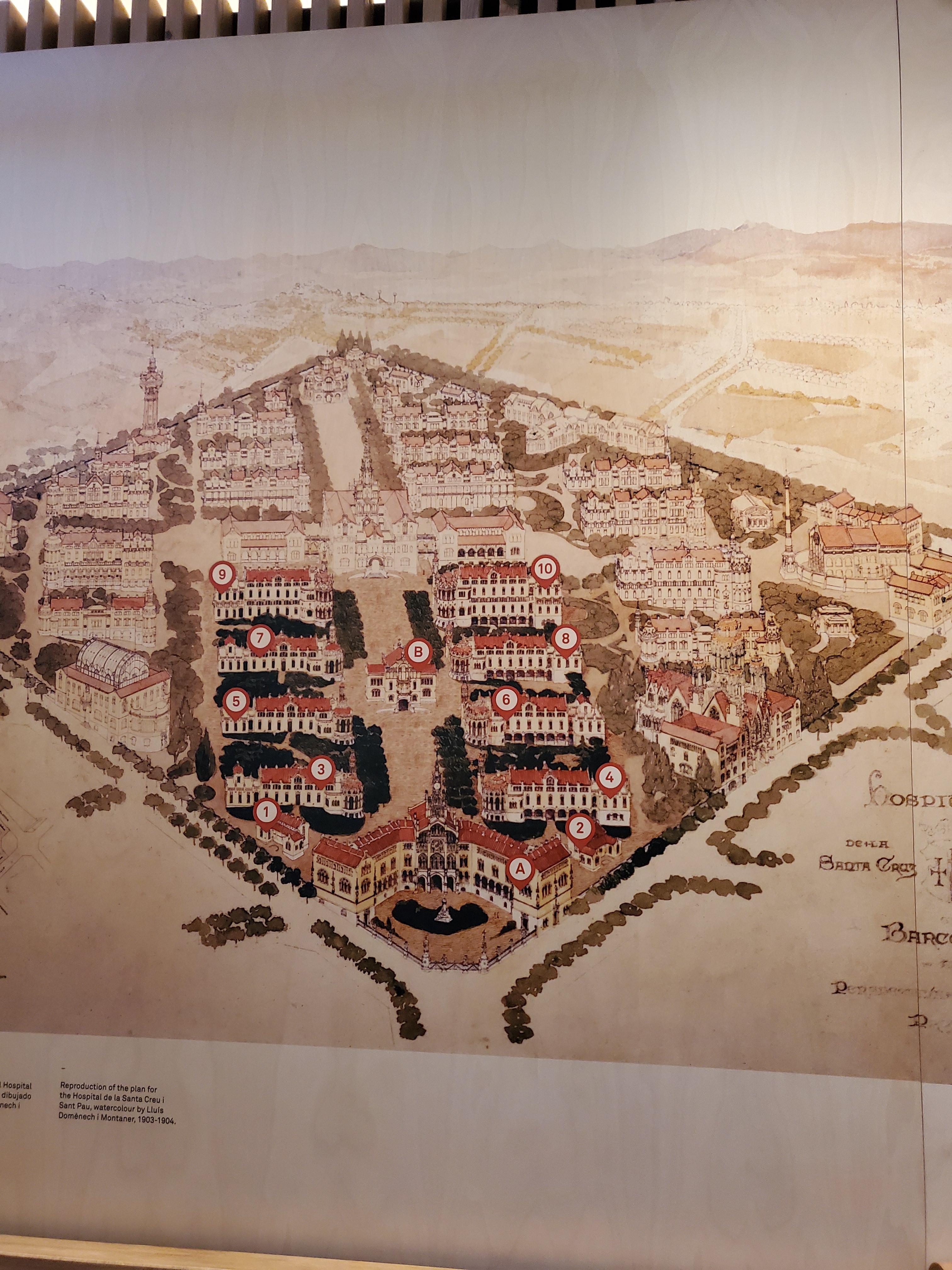 산 파우 병원의 1902년 설계 및 건축은 루이즈 도메네치 몬타네르(Lluis Domenchi Montaner)가 맡아서 카탈루냐식 모더니즘과 네오고딕양식이 잘 어울러지도록 디자인을 하게 됩니다. 디자인도 병원의 느낌이 나지 않게 "정원 도시"의 느낌으로 외관을 배치 디자인하는 게 직접 보니까 놀이동산 느낌이 살짝 납니다.