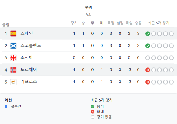 스페인이 속한 A조는 스코틀랜드와 함께 조 1위를 지키고 있고