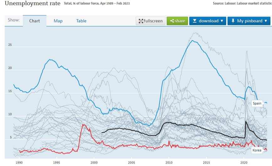 이번 포스팅에서는 제목 그대로 OECD통계를 이용해서 스페인에 대해 한번 바라볼 겁니다.