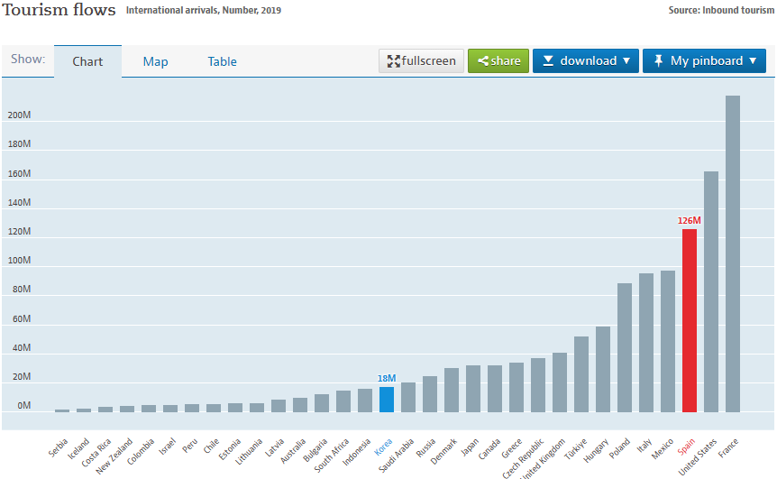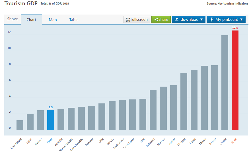 코로나 이전 스페인의 GDP대비 관광업 비율 12.4%로써 한국보다 약 5배 더 높은 국가입니다. 한국은 관광이 발달하기 이전부터 제조업을 통한 무역업으로 외화를 버는 국가입니다. 개인적으로는 한국의 국제적인 위상을 한번 생각해 보면 관광업을 통한 외화 수익을 늘릴 때라고 많이 생각합니다. 코로나 한국에 방문하는 외국인 숫자가 연당 1800만이라고 알고 있는데, 일본이 3200만 명이 방문하는걸 감안하면 적어도 2500만은 방문해야 괄목할만한 성과를 얻었다고 생각되네요