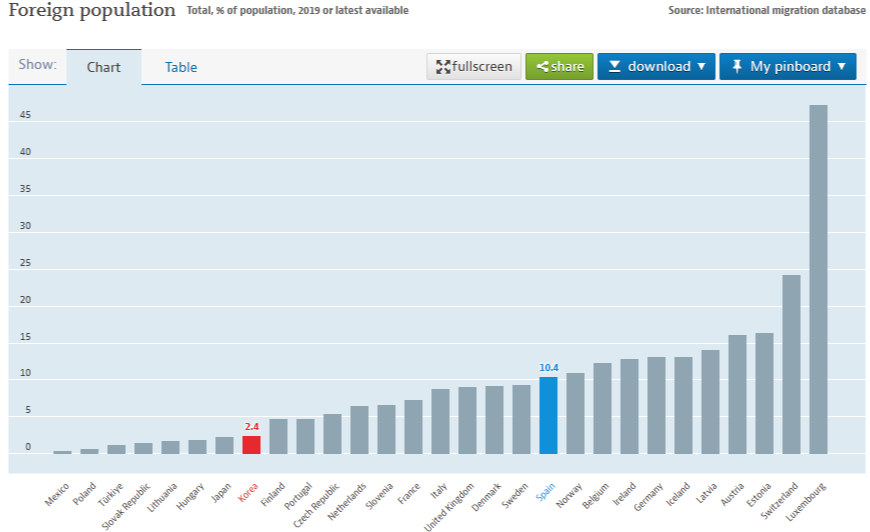 최신기록이 19년도 밖에 없네요. 19년도 기록에 따르면 한국에 거주하는 인구 중 2.4%가 외국인이고, 스페인은 10.4%라고 합니다. 한국의 경우 한국에 거주하는 외국인의 대다수가 중국,. 동남아에서 오는 사람들인데요.
