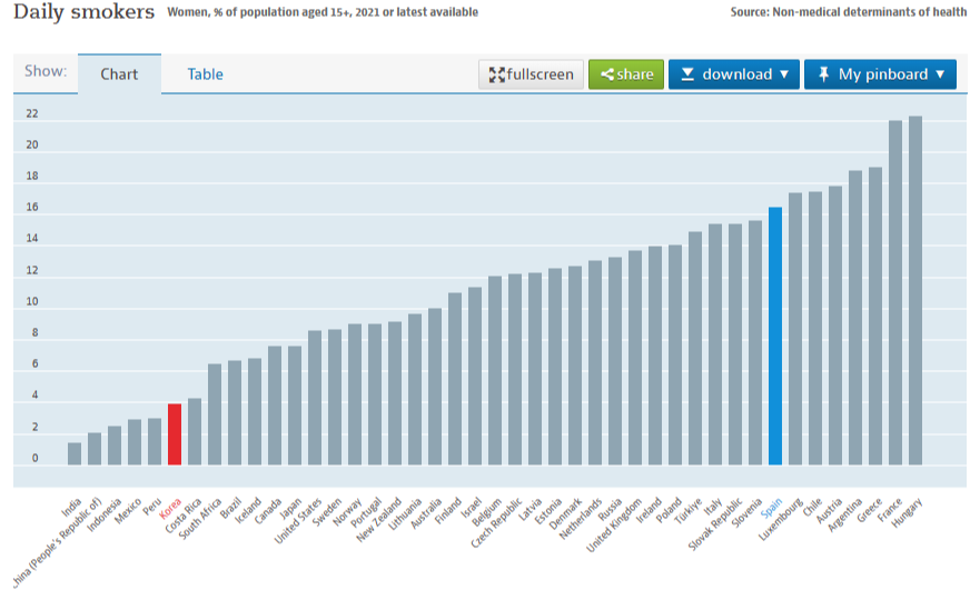 네 맞습니다. 차트를 보다시피 여성의 흡연율이 압도적으로 높은 국가 중 하나가 스페인입니다. 제가 스페인어를 배울 때 가르쳐주시던 교수님이 말하시길.
