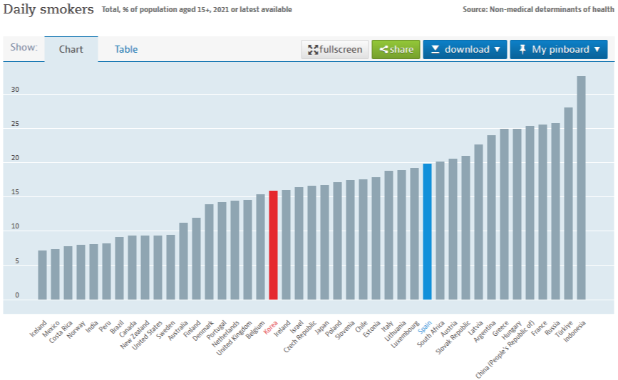 위의 차트는 2021년. 15세 이상인구중의 흡연율을 나타낸 겁니다. 한국은 15%를 겨우 넘은 거에 비해 스페인은 거의 20%에 육박합니다. 한번 성별을 분리해 보겠습니다.