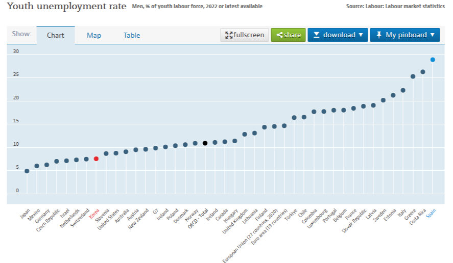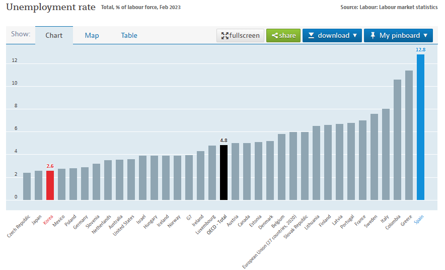 차트에 보이는 실업률은 12.8%로. 차트에 있는 나라들 중 제일 높은 수치를 기록하고 있습니다. 근데 사실 12~13%대라면 스페인에서는 실업률이 낮은 편에 속한 편입니다. 실업률이 높을 때는 20%를 넘어갈 때도 있고... 한 자리일 때가 보기가 힘들다고 할 수 있겠네요