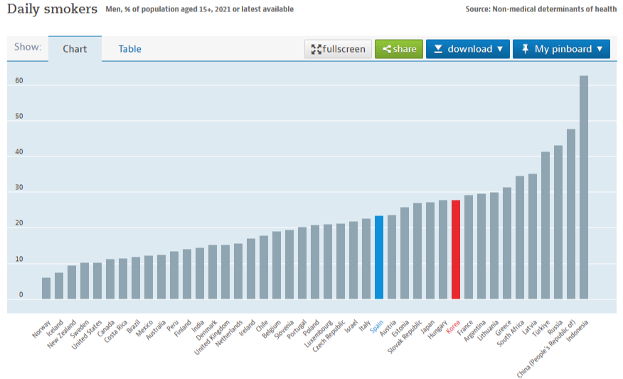 전제 인구에 반해서 남성 흡연율은 스페인 보다는 한국이 더 많습니다.