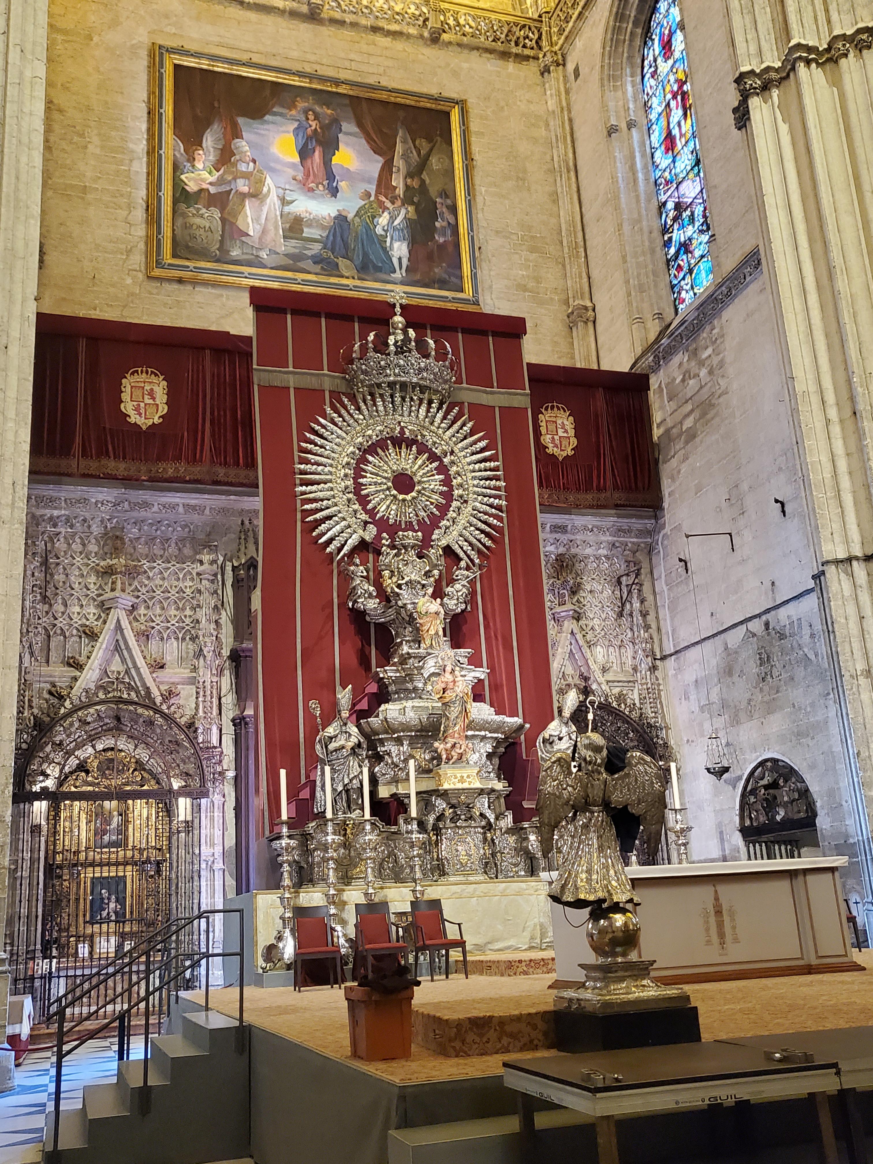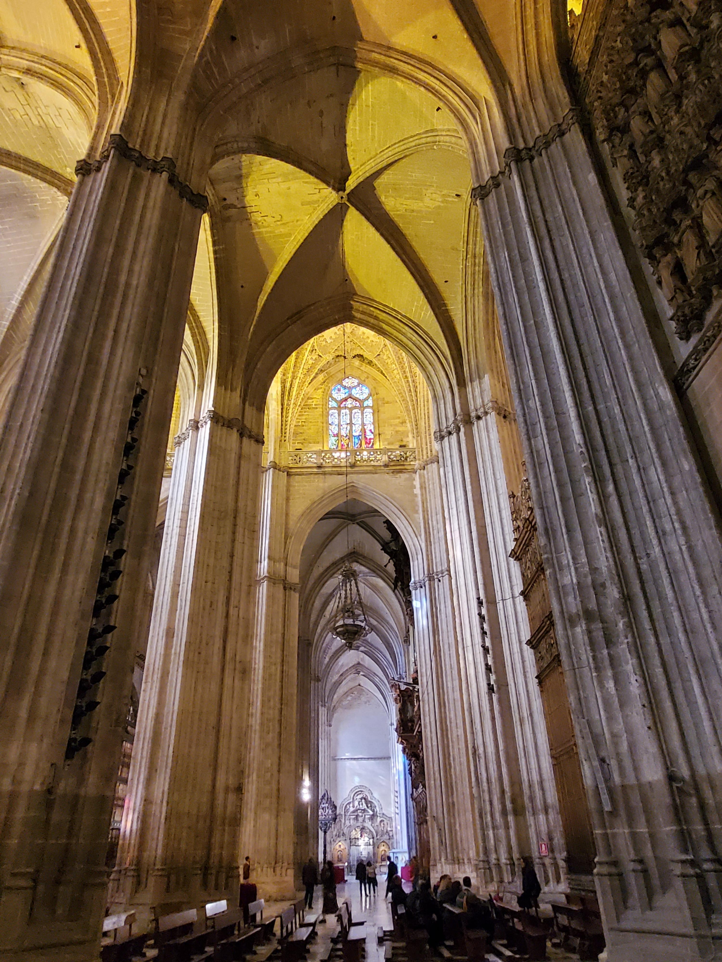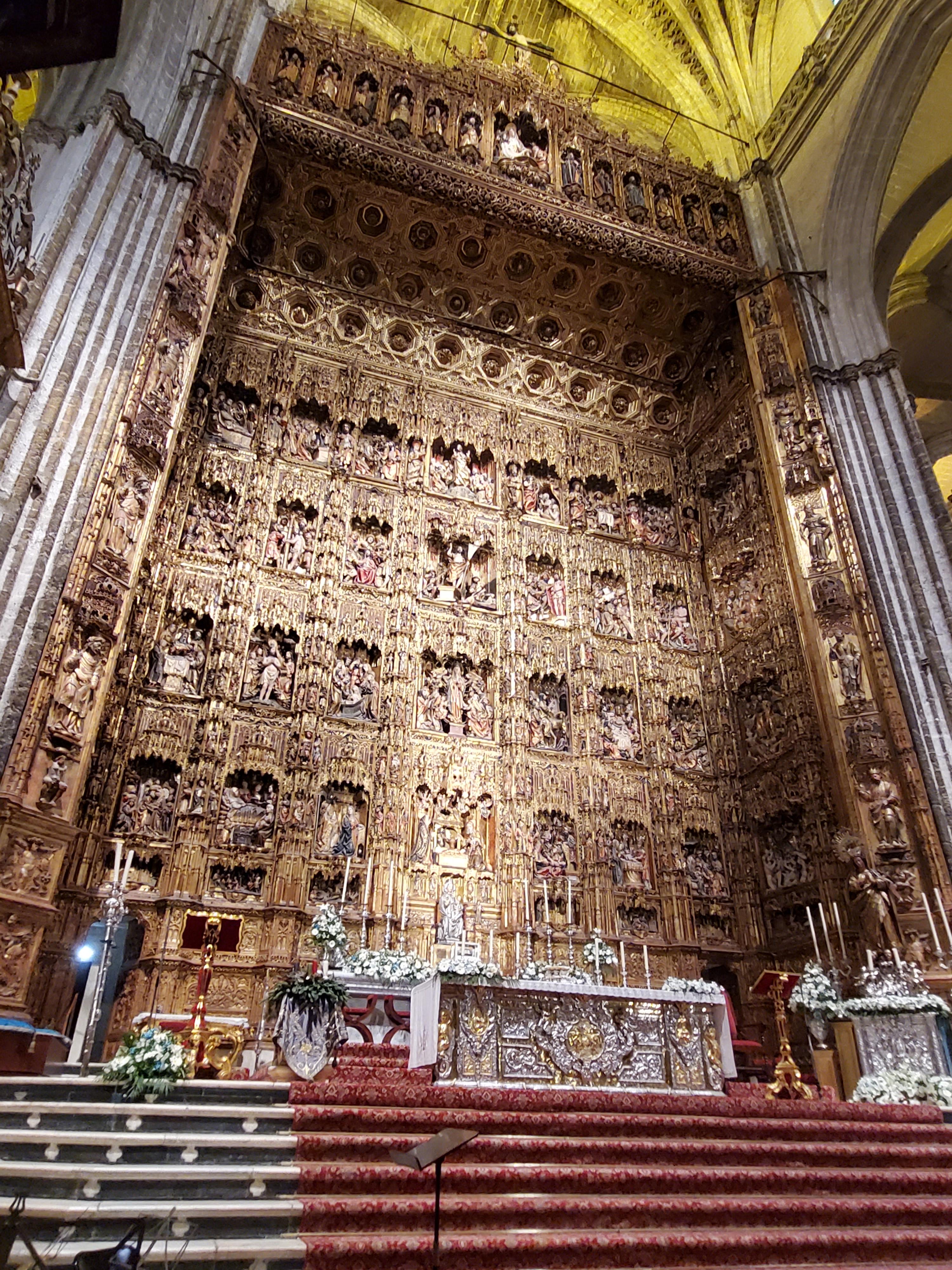 세비아 대성당은 세로 135m, 가로 100m, 높이 40m이며 히랄다 탑을 포함하면 높이는 105m 까지 치솟아 오릅니다. 왕실 예배당 이외에서 크고 작은 예배당들이 80여 개 정도 존재하고, 44개의 부조(浮彫) 200개 이상의 성인상이 있다고 하니 구경거리가 적지는 않아 보입니다.
