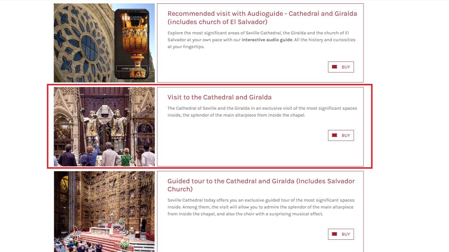 4. 다양한 종류의 티켓이 있는데, 가운데 Cathedral and Giralda에 있는 BUY를 클릭해 줍니다. (오디오 가이드와, 가이드 부분에는 한국어를 지원하지 않습니다)