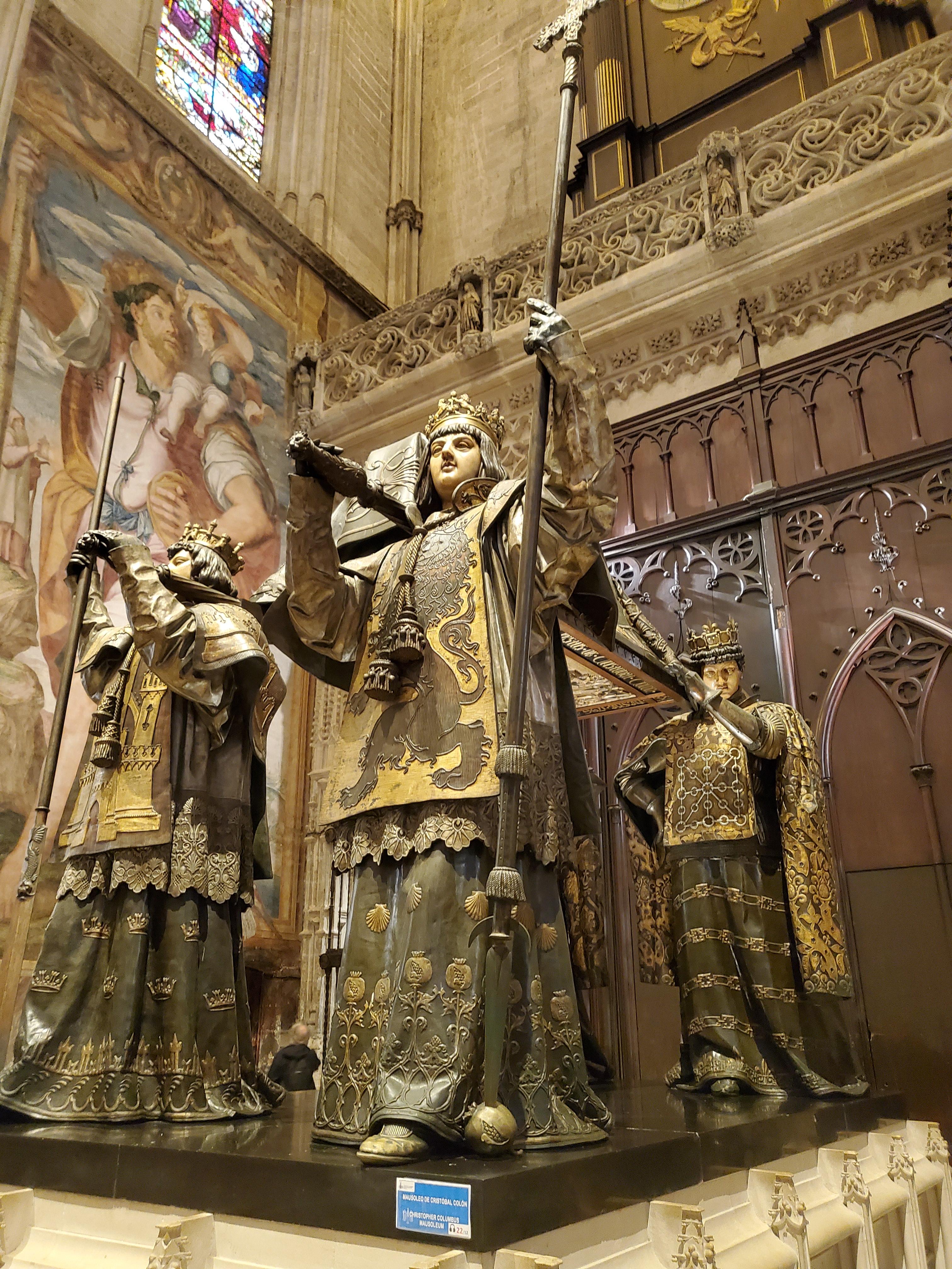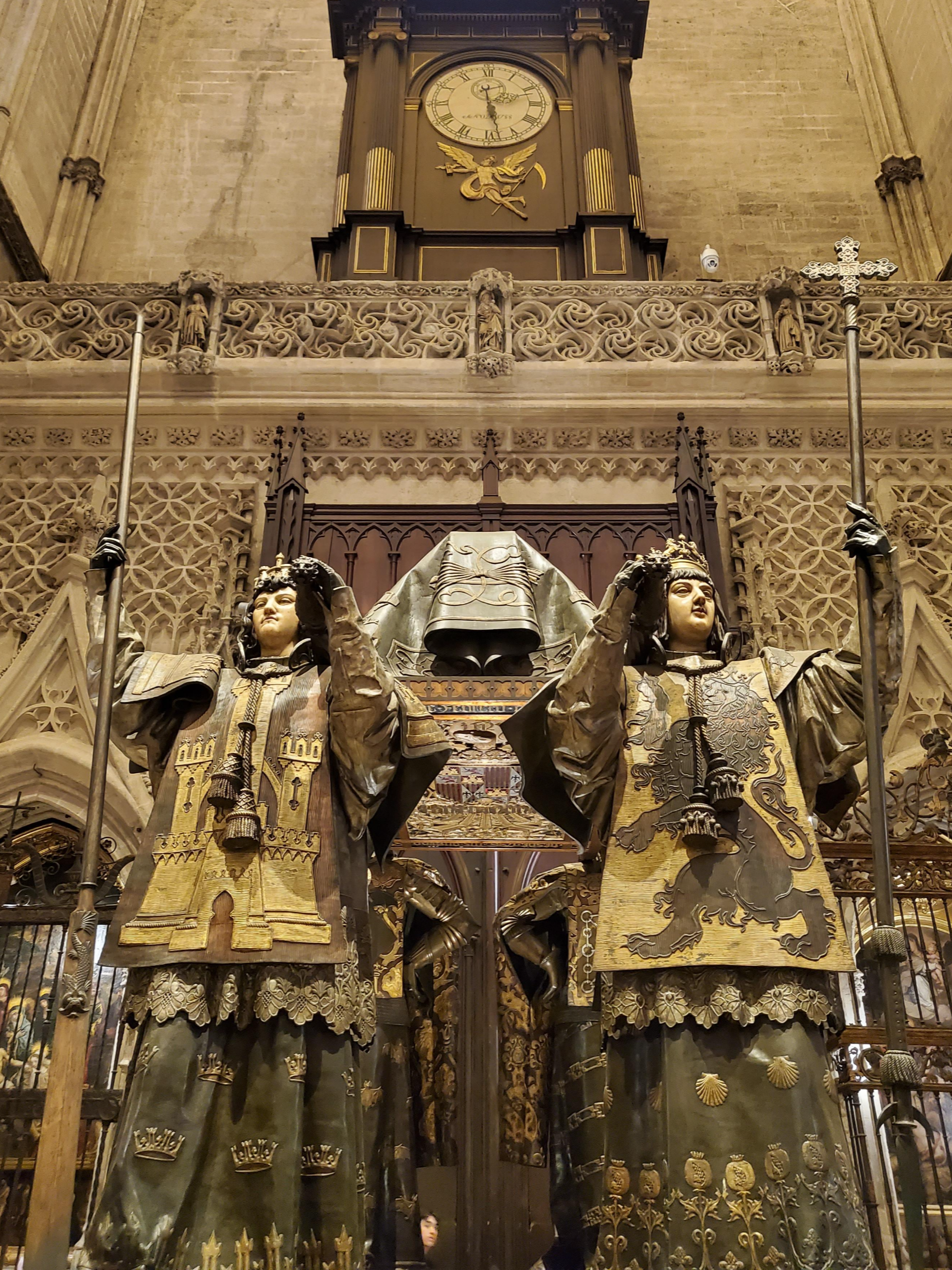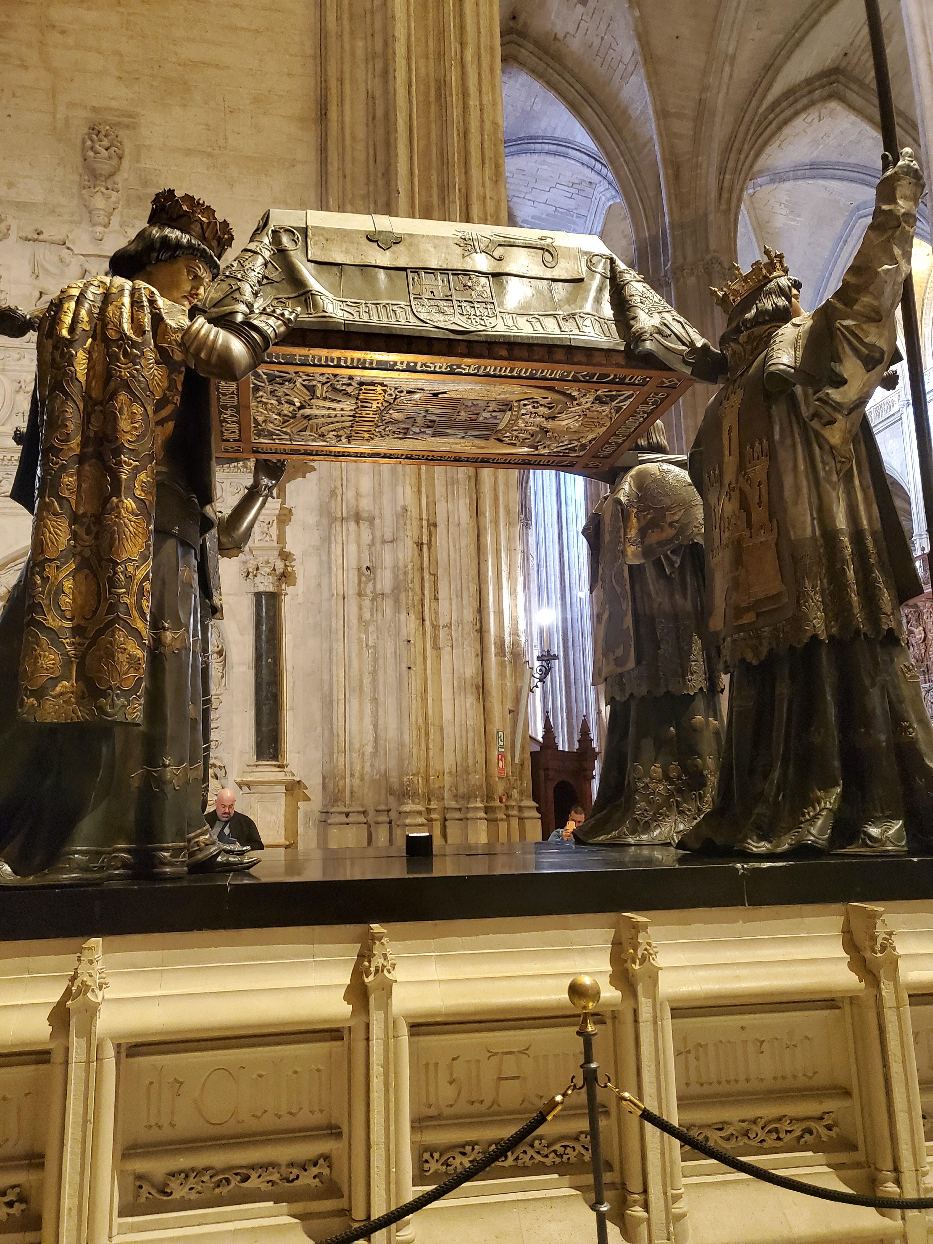 이쯤 되면 세비야 대성당 얘기와 별개로 콜럼버스의 유해 얘기를 안 할 수 없습니다. 아메리카 대륙을 갔다 온 콜럼버스 말입니다. 이미 아시다시피 세비야 대성당에는 콜럼버스의 유해가 묻혀있기로 유명하죠. 크리스토퍼 콜럼버스는 1506년에 사망한 뒤 바야톨리드라는 도시에 묻혔다가 3년 뒤 세비야로 옮겨집니다. 하지만 콜럼버스의 유언에 따라 유해는 산토 도밍고(도미니카 공화국)로 옮겨졌지만, 1778년 다시 유해는 쿠바로 옮겨집니다(돌아가셔서도 본의 아닌 여행(?)을 하시네요. 그러다가 쿠바가 스페인의 마지막 식민지에서 독립하게 되었을 때, 1898년이 되어서야 지금의 세비야 대성당에 유해가 안착하게 됩니다. 또 모르겠네요. 몇 십 년 후에 또 이사 가실 지도 ㅎㅎ