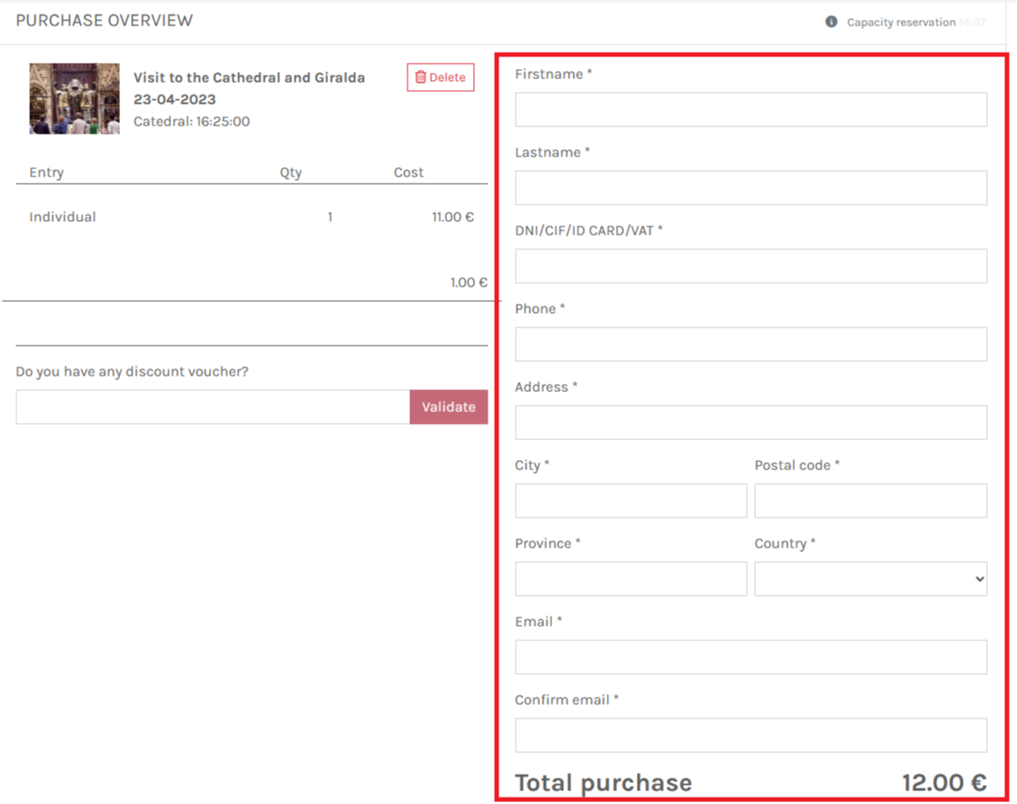 예약 시 수수료로 1유로가 추가되어 성인 1인당 결제 금액은 12유로입니다