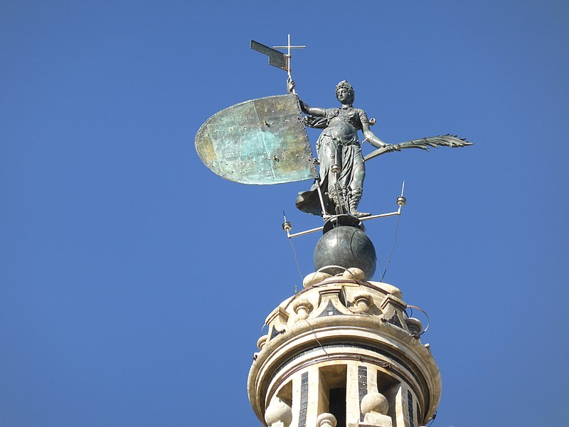 특히나 탑 지붕에는 승리의 신앙을 상징하는 4m 높이의 왕관을 쓴 청동여신 조각상이 올라갔고, 그 여신상은 풍향계를 잡고 있습니다. 라틴어로 풍향계를 Giraldillo라고 했기 때문에, 현재 히랄다 탑(torre Giralda)이라는 이름이 Giraldillo에서 왔음을 알 수 있습니다. 청동 여신상은 "승리한 신앙의 승리"라는 별칭을 가지고 있습니다. 전형적인 르네상스의 스타일 지붕으로 장식됐습니다.