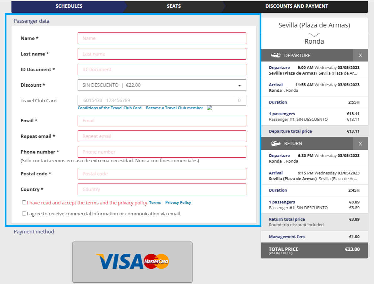 5) 론다에서 세비야로 오는 버스 시간대를 클릭한 뒤(가격대를 클릭), 우측 하단에 continue를 클릭해주세요