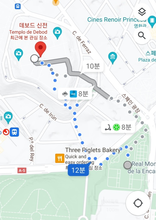마드리드 왕궁과 알무데나 대성당을 관람하고 나니 2시에 가까운 시각이었습니다. 근처 식당이나 카페도 없어서 뭐 먹으러 가긴 애매하고 해써 곧장 데보드 신전을 향해서 북쪽을 향했는데요.