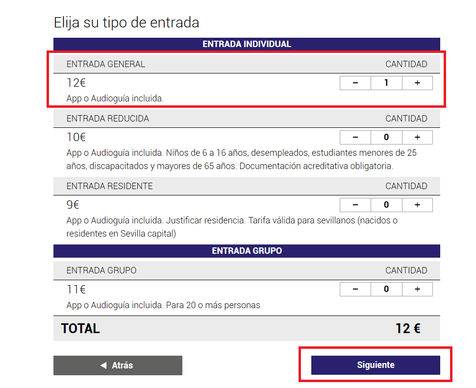 동행 인원만큼 수량을 체크하신 뒤 Siguiente를 클릭해 주세요