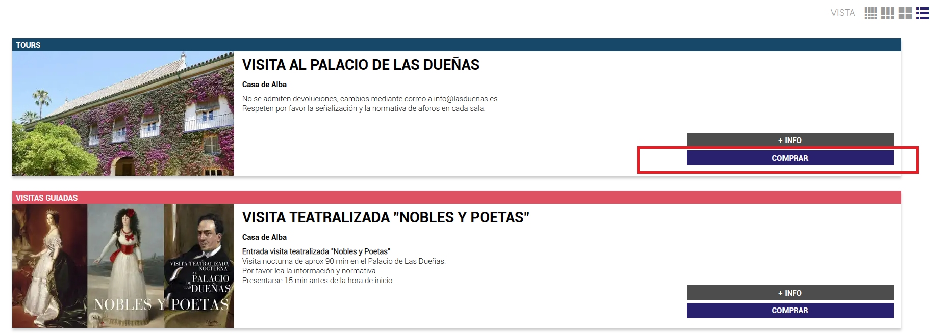 예매를 위해서 Visita al Palacio de Las Dueñas (라스 두에냐스 방문) 부분의 comprar를 클릭해 주세요