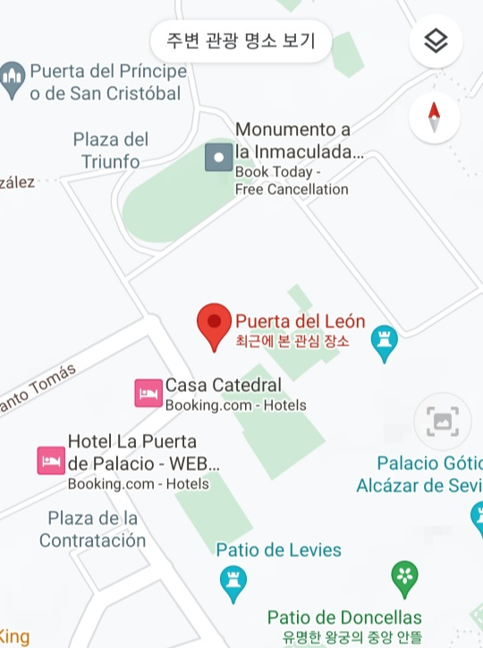 이 문의 이름은 Puerta del León으로 레알 알카사르로 들어가는 입구입니다. 티켓이 있어야 입장가능 하니 인터넷으로 예매를 하시거나 매표소에서 입장권을 구매해야 들어갈 수 있습니다.