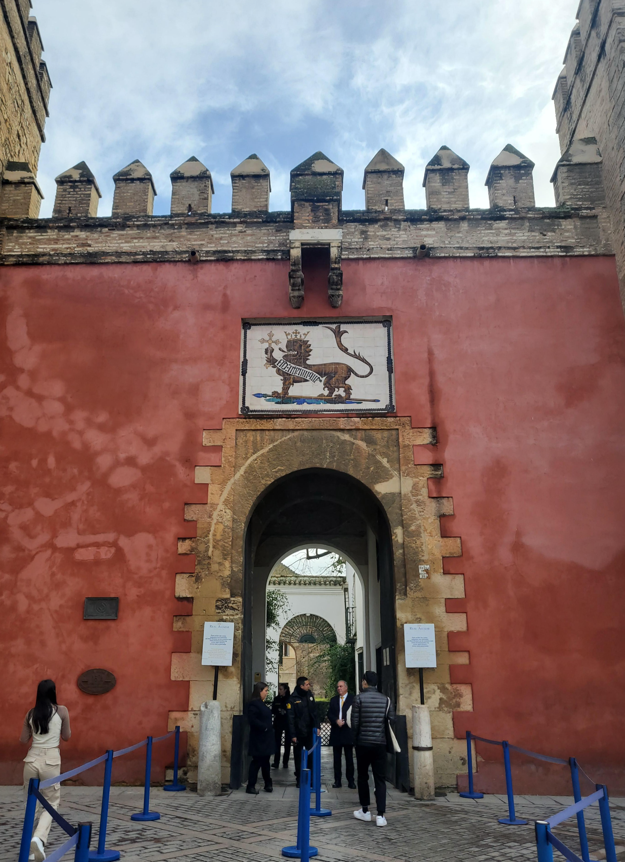 여러분이 레알 알카자르로 들어가는 입구문을 찾으신다면 아래와 같은 빨간벽에 성문 중앙에 사자 그림이 있는 성문을 찾으시면 됩니다.