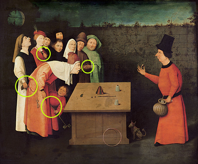 아래 그림들을 한번씩 보신 적이 있을 겁니다. 그림의 배경이 16세기 초 그림이지만, 오른쪽에 야바위꾼? 마술사? 어떤 행동을 할 동안 사람들의 시선이 마술사에게 향하고 그때 그림 속에서는 약 3~4명의 사람들이 소매치기를 시도합니다.