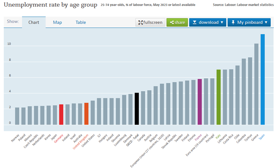 OECD 통계에 의하면 2023년 만25세~만74세의 실업률은 스페인이 11.4%로 OECD가입국가 중 1위를 차지했습니다