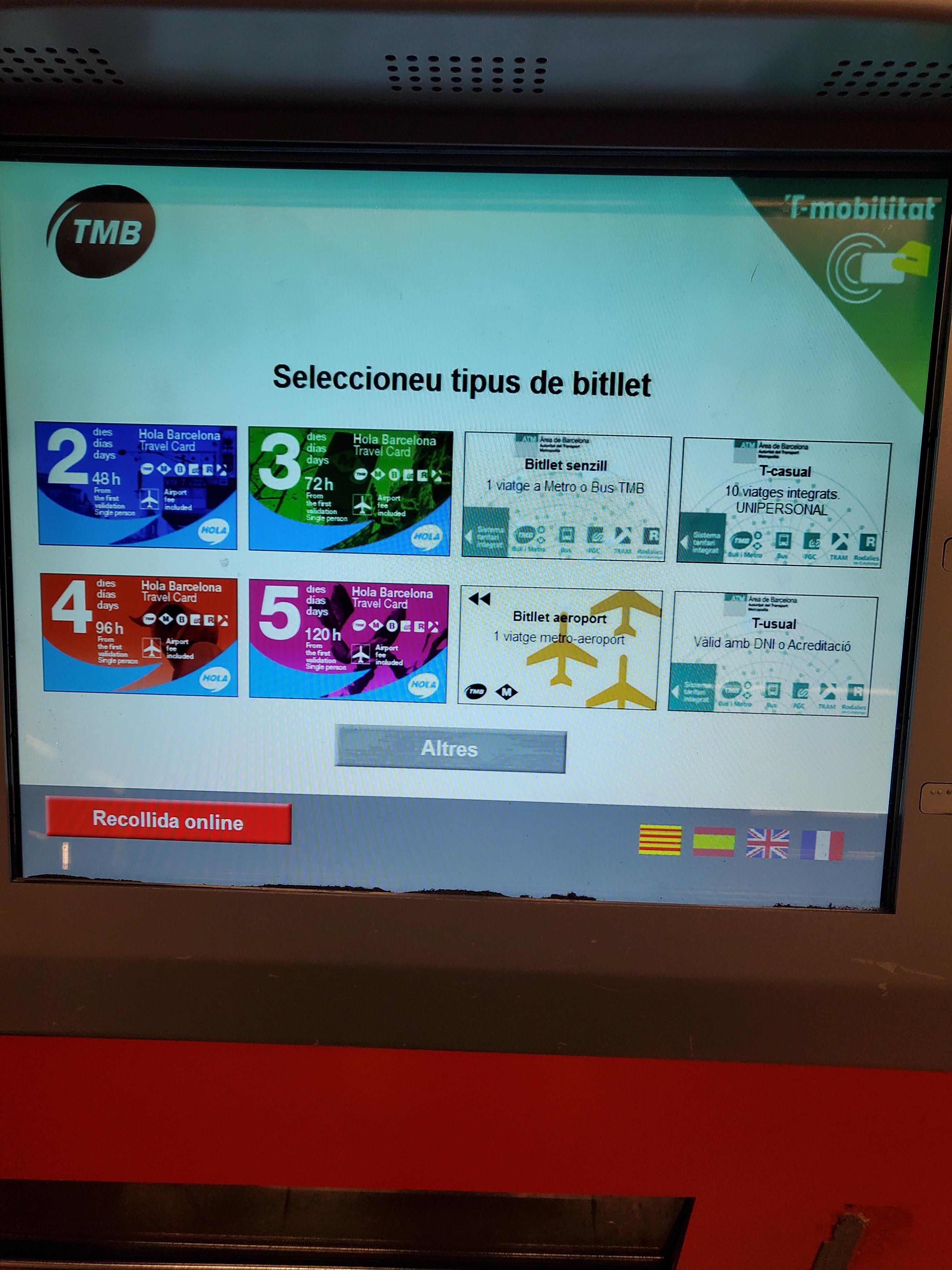 바르셀로나 지하철에 가면 아래와 같은 모양과 색깔의 매표 기기들이 있습니다. 이 앞으로 가서 매표 구매를 시작합니다.